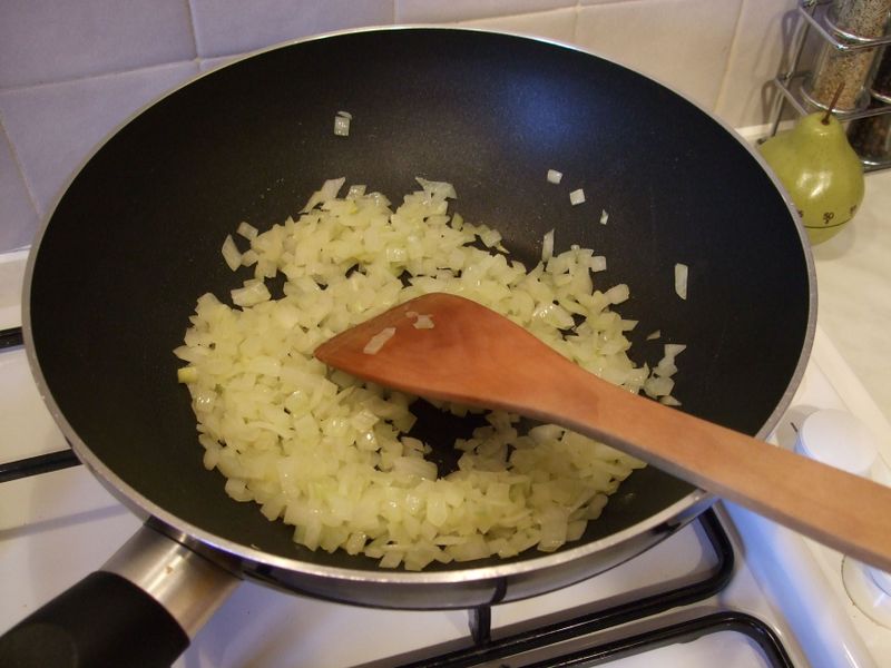 The first thing to do is to finely chop the onion and fry it until sort on some olive oil.