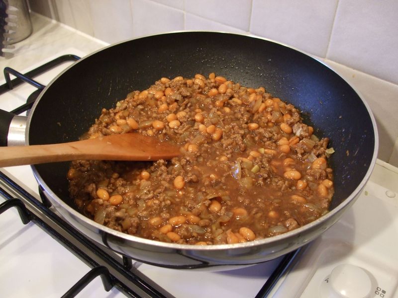 Once this is done you should add the mince to the pan and then continue to fry until it is all brown. When you’ve reached this stage then the baked beans, two (generous) tablespoons of black treacle and a slug of white wine vinegar should be added and everything stirred together.
