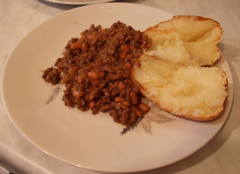 Cowboy Bean Hash (our chosen name!) is a meal that Mr C’s mum originally taught him to make. Quite where it came from we’re unsure. She may well have got it from Delia (many of her meals were) but we can’t swear to it. The minimal ingredients and general style make us think not – but we may be wrong. In short the only things you need are an onion, minced beef, a can of baked beans, black treacle and white wine vinegar (and a jacket potato or two to serve it with).